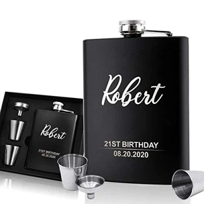 Personalised Hip Flask is a special gift for Dad as a Father's Day Gift. Also suit for best men, groomsmen, usher, boyfriend, clients and your loved one on birthday, Christmas Day and Thanksgiving day. We’ re confident that your ‘someone’ will love it as a gift. 6 oz laser engraved hip flask+2 cups make it convenient for drinking, 1 funnel that makes filling with liquor a breeze, it is easy to store when not in use, also making a nice present Material: Stainless Steel, safe and durable, you certainly don't have to worry about the interior metal eroding. Solid built but lightweight that you can carry it around comfortably. Height 4.33 inch (11 cm) , width 3.74 inch (9.5 cm) ,Depth 1.18 inch (3 cm) Click "Customise Now" and enter the required text. We will lay it out on the product in the perfect way using the design and fonts shown in the pictures., Manufacturer: EDSG