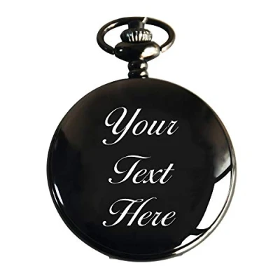 Personalised pocket watch with free laser engraved message. Ideal customized gift for Father's Day, Birthday, Christmas Available in BLACK and SILVER with elegant gift box Quartz movement - easy time setting and case release button Diameter is approx 1.8 inch,thickness 0.6 inch. Comes with a 37.5cm chain. Click Customize Now to creat the unique father's day gift.