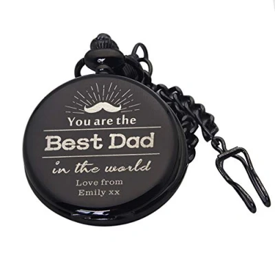 Personalised pocket watch with free laser engraved message. Ideal customized gift for Father's Day, Birthday, Christmas Available in BLACK with elegant gift box Quartz movement - easy time setting and case release button Diameter is approx 1.8 inch,thickness 0.6 inch. Comes with a 37.5cm chain. Click Customize Now to creat the unique father's day gift.