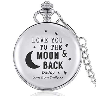 Personalised pocket watch with free laser engraved message. Ideal customized gift for Father's Day, Birthday, Christmas Available in SILVER with elegant gift box Quartz movement - easy time setting and case release button Diameter is approx 1.8 inch,thickness 0.6 inch. Comes with a 37.5cm chain. Click Customize Now to creat the unique father's day gift.
