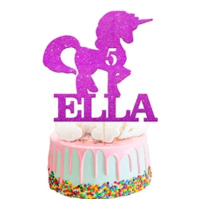 EDSG Personalised Unicorn Cake Topper Custom Decoration with Any Name & Age Multicolour Glitter Party for Girls Boys 3 5 7 12 16 18 21 30 (Purple)