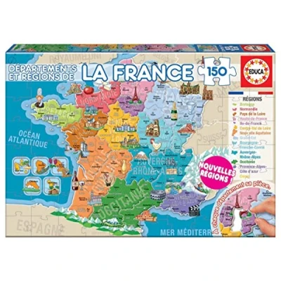 This puzzle consists of finished 150 pieces perfect for easy and safe assembly. put together this puzzle to discover the departments and the new regions of France. 6 years and up. Dimensions of the puzzle when assembled: 40 x 28 cm., Manufacturer: EDUCA