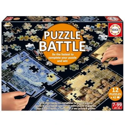 A real battle of pieces! Choose an image, quickly find the pieces and be the first to complete your puzzle to become the winner and... win! Educa brings you the most comprehensive collection of Puzzle Battle Art games on the market, with the best images. It contains 12 puzzles of 42 pieces (504 pieces), 12 cards with pictures, dice, hourglass and instructions. Approximate measurements of each puzzle: 168mm x 118mm. Stimulate Mind and Creativity: Educa puzzles are a perfect activity to develop fine motor skills, visual memory and psychomotor skills, as well as stimulate the curiosity and imagination of children and adults. Environmentally friendly product thanks to its production with vegetable inks, these are based on renewable and organic materials with almost no release of VOC (volatile organic compounds). Made of high-quality materials and an optimal fit. Creating puzzles since 1967, Educa stands for quality and experience. Made of high-quality materials and an optimal fit. Creating puzzles since 1967, Educa stands for quality and experience. Recommended from 7 years., Manufacturer: Educa