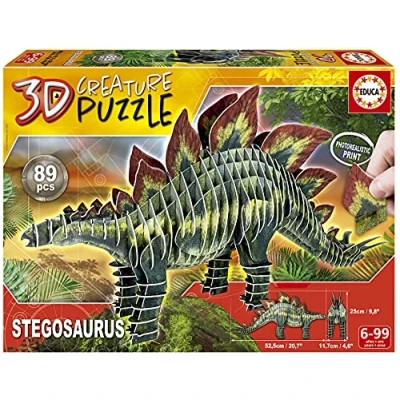 3D Puzzle Dinosaur Stegosaurus. Build an amazing creature with this 52.5cm long 3D puzzle. 89 thick cardboard pieces printed on both sides with a photorealistic image. Designed with high quality materials and rigidity that facilitate assembly and subsequent exposure ∙ Puzzle made of environmentally friendly material, FSC certified cardboard. The inks used in this product are environmentally friendly inks and renewable materials of organic origin An activity to develop manual skill, spatial vision, attention and concentration while riding your favorite creatures and dinosaurs. Each piece is numbered to aid in the assembly of this Stegosaurus. Recommended age of 3D puzzle: 6 years, Manufacturer: Educa Borras