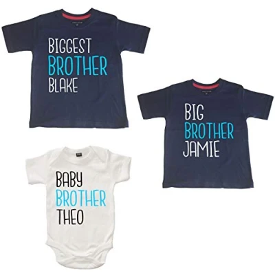 Edward Sinclair 2 T Shirts & 1 Bodysuit Set Personalised Biggest Big Baby Brother Navy Kids (White/Sapphire Print) White (Black/Sapphire (Combo)