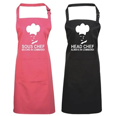 Matching Apron Gift Set includes 2 aprons one for the Headchef and one for the Sous chef! These aprons are made from 65% Polyester and 35% Cotton Twill A full bib apron complete with a pocket and a self adjusting fabric neck, self fabric ties 90cm with a sliding adjusting buckle Machine washable but wash at 40 degrees and less and turn gament inside out Do not iron directly onto design and do not tumble dry