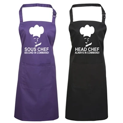 Matching Apron Gift Set includes 2 aprons one for the Headchef and one for the Sous chef! These aprons are made from 65% Polyester and 35% Cotton Twill A full bib apron complete with a pocket and a self adjusting fabric neck, self fabric ties 90cm with a sliding adjusting buckle Machine washable but wash at 40 degrees and less and turn gament inside out Do not iron directly onto design and do not tumble dry