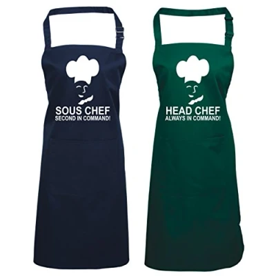Matching Apron Gift Set includes 2 aprons one for the Headchef and one for the Sous chef! These aprons are made from 65% Polyester and 35% Cotton Twill A full bib apron complete with a pocket and a self adjusting fabric neck, self fabric ties 90cm with a sliding adjusting buckle Machine washable but wash at 40 degrees and less and turn gament inside out Do not iron directly onto design and do not tumble dry