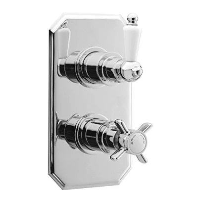 Bring an air of Edwardian Elegance to your shower with the charming period inspired Twin concealed valves. With both traditional flat crosshead and lever handles, contrasting white ceramic detailing and an edged back plate This valve will enhance your shower. The beautifully designed valve doesn't compromise on functionality or safety. The thermostatic valve has built in safety anti scald, and will shut down in the event of hot or cold water failure. And the thermostatic control keeps the temperature within +/- 2 to 3 degrees even with pressure fluctuations. The valve is proudly manufactured in Great Britain from brass and ABS With a sleek Chrome finish and suitable for use with all systems (Gravity fed pumped, unvented high pressure or fully modulated combi-boilers). the cartridge is highly resistant to calcium build up and has excellent flow rates, even at low pressure. Dimensions: W- 120mm, H- 210mm, D- 135mm 5 year Manufacturer's guarantee, Weight: 6.0847584312 Pounds, Manufacturer: Ultra