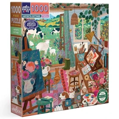 1000 PIECE PUZZLE: Includes 1000 sturdy, dustless, glossy double-coated puzzle pieces that snap together with ease. A high quality jigsaw puzzle for adults and families. FULL-COLOR INSERT: Includes a full-color image insert for reference to examine details up close while you assemble the puzzle. PERFECT TABLETOP SIZE: Completed puzzle measures 23" x 23", with a compact 10" x 10" x 2" box for easy storage and travel. CREATE BEAUTIFUL WALL ART! Glue the puzzle together once completed and mount on your wall. LISTEN TO THE ARTIST'S PLAYLIST: Each of our artist’s shares a curated playlist for you to puzzle along to via QR code on box. Provides a full immersive experience. SUSTAINABLY SOURCED: Made with recycled board and printed on FSC-certified paper using vegetable-based inks. WOMAN-OWNED business dedicated to sustainability, safety, and the creation of original and extraordinary products., Manufacturer: eeBoo