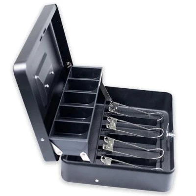 effektivo Cash Box with Note Compartments and Hold Down Holders, 4 Clips, 5 Coin Compartments, Lockable, Colour: Black