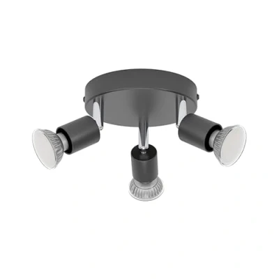 The 3-light ceiling spotlight made of black steel and plastic with a round canopy and three adjustable spotlights provides timeless lighting in your living spaces The spotlight bar is flexibly usable in hallways, kitchens, bedrooms or offices; depending on the light colour and brightness of the bulb used, the lamp provides cosy ceiling lighting in living areas or functional lighting in workspaces Dimensions: Height 7.5 cm, diameter 14 cm