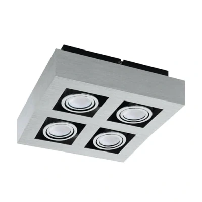 4-bulb LED ceiling light with a discreet look The elegant Loke ceiling light not only impresses with its appealing design, but also with its performance. With 1200 lumens, it provides energy-efficient, discreet lighting that can be positioned precisely thanks to the swivelling LED spotlights. A chrome-plated steel ring surrounds the individual spotlights, setting them apart from the angular body. The brushed aluminium with its simple colour scheme blends in perfectly with any modern interior, making the ceiling light versatile and suitable for use in a variety of rooms. It can also be mounted on the wall. Warm white LED bulbs are included.