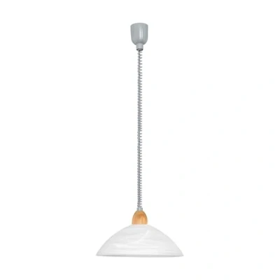 The pendant light made of silver-coloured, matte nickel plastic and a beech wood element with a round lampshade made of high-quality white alabaster glass blends seamlessly into classic interior styles The pendant lamp provides a homely lighting with its classic design in any room – whether in the kitchen, living room or dining room above the dining table Dimensions: Height 110 cm, Diameter 36 cm