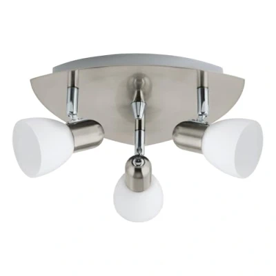 The ceiling light made of metal in matte nickel with three adjustable spots made of frosted white glass fits seamlessly into the modern trend The ceiling light provides optimal illumination in any room with its appealing design – whether in the kitchen, living room, hallway or bedroom Dimensions: Diameter 26.5 cm