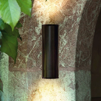 Energy-saving but still extremely bright: the Riga LED outdoor wall light This outdoor wall light with its energy-efficient LED lighting technology is ideal for giving the front of your house a unique appearance. With its cylindrical shape and an antique brown finish, the light can be a decorative lighting object on a balcony or patio, for example. Two GU10 LED bulbs cast the light vertically out of the lamp body, which results in a fabulous light being created on the wall.