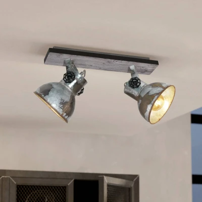 Two-bulb Barnstaple ceiling light with a vintage design The canopy of the two-bulb Barnstaple ceiling light is made of metal and has a brown varnished wooden panel. The two vintage-style steel lampshades with a worn zinc finish, the so-called used look, can be rotated as you wish. The two black adjusting wheel screws can also be used to adjust and lock the tilt as you wish. This means that the two-bulb Barnstaple ceiling light guarantees targeted lighting and provides a fantastic accent on the ceiling thanks to its trendy vintage design.