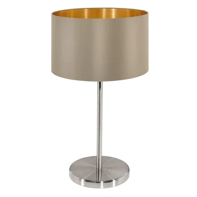 The table light fitting is equipped with a taupe-coloured lamp shade with an inner golden surface and gives your rooms a cosy atmosphere, whether in the living room, bedroom, dining room, hallway or kitchen The modern material mix of noble steel in matt nickel and the taupe-coloured lampshade create a classic, homely and at the same time modern look The table lamp has a switch on the cable for convenient switching on and off; Combine this interior lighting with other lamps from the Maserlo series such as floor lamp, pendant lighting, wall lamp and ceiling lamp The light bulb is not included in the scope of delivery and is available separately (product EGLO 110051); Suitable for any type of light bulb with E27 holder, maximum wattage 60 per socket Dimensions: height: 42 cm/ 16.5 inches, diameter: 23 cm/ 9 inches