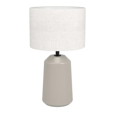 AmazonIP20 rating Sandy-coloured ceramic base with a ribbed surface Fabric linen lampshade Operated via the in-line switch Perfect bedside lighting