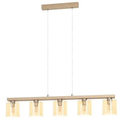 AmazonThe dining table lamp with its five lampshades made of amber-coloured glass with nickel-matt details, the suspended wooden beam made of FSC-certified wood and the natural-coloured canopy fits seamlessly into the modern trend No light source included in the scope of delivery; the filament LED light source shown is available separately under EGLO 110001 Dimensions of the pendant lamp: length: 121 cm, width: 15 cm, height: 110 cm