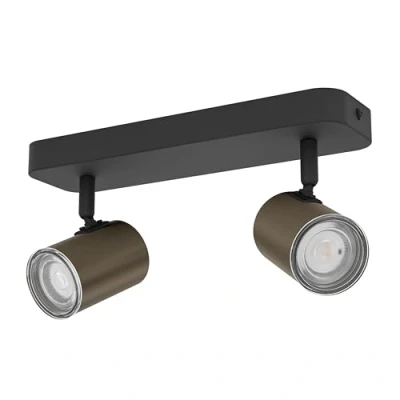 The modern ceiling spotlight made of black steel features two adjustable bronze-effect spotlights that can be individually directed, providing flexible and targeted lighting No light bulb included in the delivery Dimensions: length 28 cm, width 8 cm, height 13 cm
