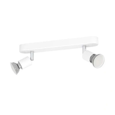 The 2-light ceiling spotlight made of white steel and plastic with a rectangular canopy and two adjustable spotlights provides timeless lighting for your living spaces The spotlight bar is flexibly usable in hallways, kitchens, bedrooms, or offices; depending on the light colour and brightness of the bulb used, the lamp provides cosy ceiling lighting in living areas or functional lighting in workspaces Dimensions: length 30 cm, width 4.5 cm, height 7.5 cm
