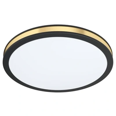 The decorative LED ceiling light made of black steel and golden plastic as well as an LED cover made of plastic in white blends seamlessly into the modern trend With its special design, the lamp offers a highlight in any room - whether in the kitchen, living room, dining room, office, hallway or bedroom. The ceiling light can also be easily used as a wall light With a lifespan of 15,000 hours, the LED lamp is particularly energy-efficient compared to a incandescent bulb or halogen lamp. The LED light protects your budget and the environment Dimensions: diameter 28 cm, height 6.5 cm The energy-saving LEDs provide pleasant warm white light (12 watts, 1350 lumens, 3000 Kelvin). This product is an surrounding product with an energy efficiency class F bulb. Ambient products are lights that can be disassembled for separate checking of the included light source(s) This product is a containing product. Containing products are luminaires that can be disassembled for a separate check of the light source(s) they contain. This product contains a light source of energy efficiency class f