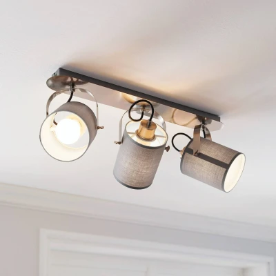 Grey ceiling spotlight Villabate with three shades The ceiling light Villabate offers a modern lighting concept with three round spotlights for bright highlights. The spotlights can be arranged in different directions to optimally illuminate particular living areas. The lamp is made of steel with a nickel matt finish and is mounted directly on the ceiling. The flexible joints of the spotlights are attached directly to the narrow, oval suspension. The cylindrical spotlights are made of grey cloth and allow individual illumination of the living area. The neutral design fits in with any modern style.