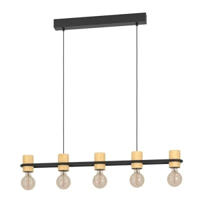 Eglo Chieveley Pendant lamp, 5 Light Hanging Ceiling lamp Above Dining Table, Black Metal and Natural Wood, E27 Socket, 88.5 cm Long