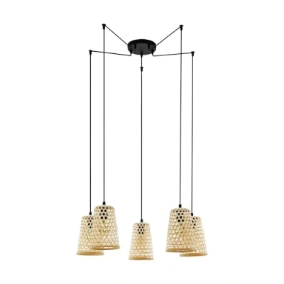 The pendant light made of black steel with decorative lampshades woven from natural-coloured wood fits seamlessly into trends such as vintage, natural, boho and hygge The individual lampshades can be attached to the ceiling; this accordingly affects the radius and height of the pendants You have complete flexibility in designing and lighting your living space No light bulb included in the delivery; The filament LED bulb is available separately under EGLO 110009; Suitable for any bulb with an E27 base, maximum 40 watts per socket; Dimmable depending on the bulb used; Dimensions: height: max 200 cm, lampshade diameter: 18 cm
