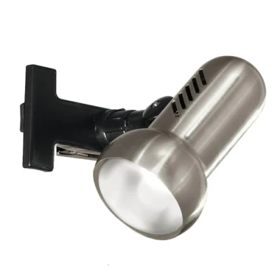 The practical clip spotlight made of matt nickel finished steal and black plastic with its adjustable clamp can be fixed without any problem on a shelf, a desk or on the headboard of a bed The mains powered bedside lamp with clamp has a cable with a plug and switch making it convenient to turn on and off, as well as to connect to a standard power socket Suitable for any type of reflector light bulb with E27 holder, maximum watts 60 W