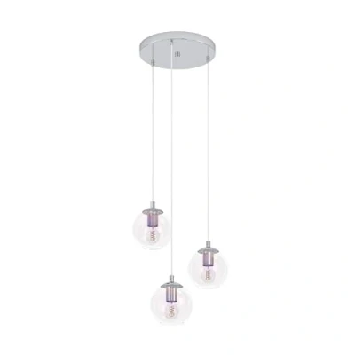 With its three iridescent glass balls hanging at different heights in rainbow colours, the round chrome-coloured metal canopy and the transparent plastic cables, this dining table lamp stylishly sets the scene in modern living spaces No light bulb included; the filament LED bulb shown is available separately under EGLO 110306 Dimensions of the pendant lamp: Height: 110 cm, diameter: 42.5 cm