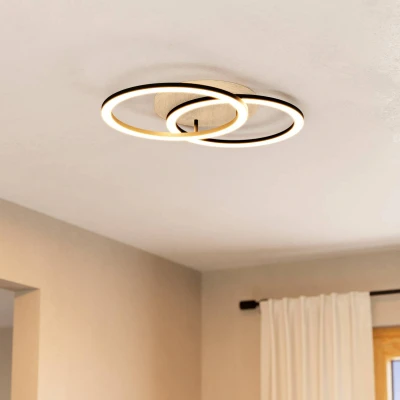 Lomaltas-Z LED ceiling light – smart control via ZigBee technology The Lomaltas-Z LED ceiling light consists of two metal rings attached to a wooden canopy. These circles contain built-in LEDs that can be controlled and dimmed via ZigBee using an app, voice assistant or, alternatively, a remote control. Whether warm white or daylight, Lomaltas-Z offers white light in a wide range of shades, providing the right light at all times, whether for relaxing or working. Functions/compatibility: - Controllable with the free AwoX HomeControl app - compatible with smart home systems from other manufacturers that use ZigBee 3.0 - Direct connection to Amazon Echo and Google Home possible - Increased range thanks to additional Bluetooth Mesh - Compatible with all items in the EGLO connect-c Bluetooth series - Can be controlled with the appropriate remote control even without internet access (see accessories)