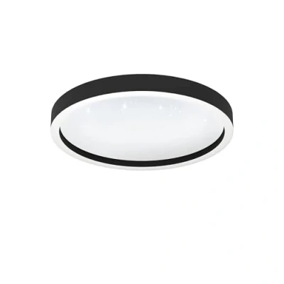 The modern LED ceiling light made of white plastic with crystal effect is surrounded by a round frame made of black aluminium with RGB lighting. The LED light can be easily set up and controlled via Bluetooth with the free AwoX app and the separately available remote control (EGLO 99099) App control options: dimming, changing the colour temperature of the inner part between warm white, neutral white and cool white (2700-6500 Kelvin), RGB (on the frame), favourite mode, light groups, timer, night light, twilight simulation, light alarm clock, presence simulation and disco function Thanks to the ZigBee 3.0 technology, you can control the smart ceiling spot via voice command (Alexa with Smarthub or Google Nest) with a compatible voice assistant with integrated bridge and turn the light on or off on the go; control via app from home requires no hub and is also possible offline Lights from the connect.z series can be used with the hub of other manufacturers; already purchased connect.c items can be easily integrated into the new system The integrated LEDs provide pleasant light (17.8 watts, 2150 lumens). Dimensions: height: 5 cm, diameter: 42 cm. This product is an surrounding product. The ambient products are lights that can be disassembled for separate checking of the included light source(s) This product is a containing product. Containing products are luminaires that can be disassembled for a separate check of the light source(s) they contain. This product contains a light source of energy efficiency class f