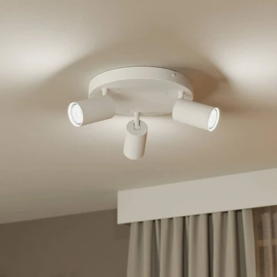 Three-lamp Telimbela-Z LED ceiling spot, smart controllableThe round Telimbela LED ceiling spot made of steel, equipped with three movable spotlights, is supplied including smart controllable light sources. These offer both coloured light from a variety of RGB light colours and white light that can be adjusted in the range from warm white (2,700 K) to daylight (6,500 K). All settings can be adjusted via the AwoX Home Control app, which is available free of charge for Android and iOS. The control of the luminaire via Bluetooth as well as ZigBee 3.0 also enables the control via compatible voice assistants and the integration of the luminaire into compatible smart home systems.A further control option is offered by the remote control available as an accessory.features / compatibility:- controllable with the free AwoX HomeControl app - compatible with smart home systems from other manufacturers that use ZigBee 3.0- direct connection with Amazon Echo and Google Home possible- increased range due to additional Bluetooth Mesh- controllable with matching remote control even without internet access (see accessories)