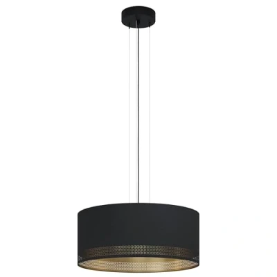 The decorative suspended luminaire made of black steel is equipped with a round black textile lamp shade with an inner golden surface and small cut-outs on the edge and fits seamlessly into trends like vintage and retro When the living room lamp is switched on, the cut-outs create a fascinating interplay of light and shadow The hanging light fixture with its special design particularly catches the eye and is a highlight in any room – whether it be in the kitchen, in the living room or in the dining room above the dining table The filament LED light bulbs are not included in the scope of delivery and are available separately (product EGLO 110051); Suitable for any type of light bulb with E27 holder, maximum wattage 40 per socket; Dimmable depending on the light bulb used Dimensions: height: max 110 cm/ 43.3 inches, diameter: 53 cm/ 20.9 inches