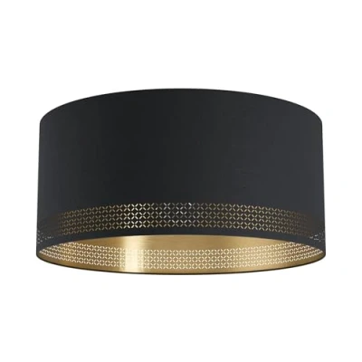 The decorative flush fitting ceiling light fixture made of black steel is equipped with a round black textile lamp shade with its inner golden surface and its small cut-outs on the edge fits seamlessly into trends like vintage and retro When the ceiling lamp is switched on, the cut-outs create a fascinating interplay of light and shadow With its special design, the ceiling lighting offers a highlight in any room – whether in the kitchen, living room, dining room, office, hallway or bedroom The filament LED light bulb is not included in the scope of delivery and is available separately (product EGLO 110053); Suitable for any type of light bulb with E27 holder, maximum wattage 40 per socket; Dimmable depending on the light bulb used Dimensions: height: 24 cm/ 9.5 inches, diameter: 47.5 cm/ 18.7 inches