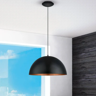 Gaetano 1 pendant light, black outside, copper inside The Gaetano pendant light is presented in trendy black and copper. The lampshade, which is wide open at the bottom, is made of metal and is painted in matt black on the outside and in shiny copper on the inside. The copper interior creates a very warm lighting effect in living rooms, dining rooms or even in the kitchen. Any type of bulb can be inserted into the E27 socket in the wide lampshade. Filament-look bulbs are particularly decorative.