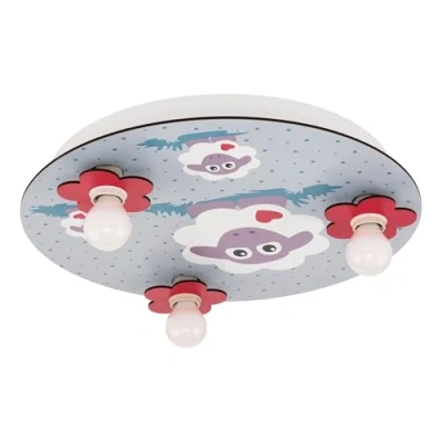 Round ceiling lamp Lalelu with three light sources Lalelu is a round ceiling lamp, which is ideal for the children's room because of its child-friendly design with sheep and flowers. The lamp is to be mounted directly on the ceiling and is made of steel and wood. The three lamp sockets are surrounded by red wooden flowers. Suitable lamps are not included in the scope of delivery, but can be ordered via the accessories.