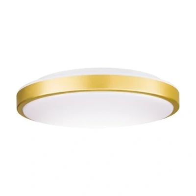 The LED light fitting combines a round, white steel housing, a plastic light surface and an elegant brass-look ring – ideal for stylish ceiling lighting in the living area With 2200 lumens and 3000 Kelvin, the ceiling spotlight provides pleasant warm white light and creates a cosy living atmosphere; thanks to the white plastic cover, the surface-mounted lamp ensures even and glare-free lighting This product is a containing product with a light source of energy efficiency class E; containing products are lighting fixtures that can be disassembled for separate inspection of the containing light source(s)