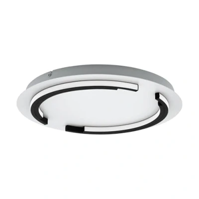 The round LED ceiling lamp made of a white metal body with four offset curved LED profiles made of black metal with white LED covers blends seamlessly into the modern trend Thanks to the linear design with low installation height, this classic surface-mounted light can be combined in many areas – whether in the living room, in the kitchen, in the dining room, hallway or bedroom The LEDs behind the white plastic light surfaces of the offset profiles provide pleasant warm white light inside and outside and thus provide indirect lighting on the ceiling (3000 Kelvin, 25 Watt, 3400 lumens); In addition, the light can be dimmed in three steps via the conventional wall switch Dimensions: height: 5 cm, diameter: 42 cm This product is an surrounding product with an energy efficiency class E bulb. Ambient products are lights that can be disassembled for separate checking of the included light source(s) This product is a containing product. Containing products are luminaires that can be disassembled for a separate check of the light source(s) they contain. This product contains a light source of energy efficiency class e