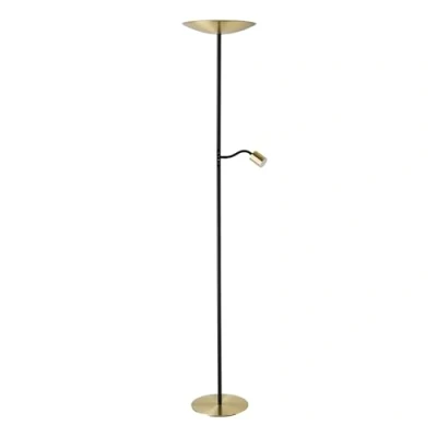 The steel standing lamp in matt brass combines a ceiling floodlight with a swivelling reading lamp – ideal as a corner lamp for indirect lighting or as a reading lamp in a reading corner The two lamps are controlled separately via a control element on the lamp stand; both light sources can be switched on and off separately or simultaneously This product is a containing product with a light source of energy efficiency class E; containing products are lighting fixtures that can be disassembled for separate inspection of the containing light source(s)