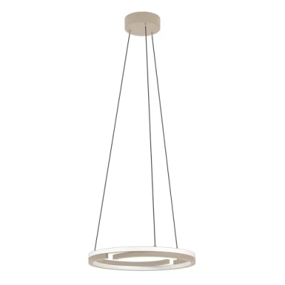 This modern pendant light with a double-curved LED ring made of sand-coloured aluminium, a white plastic light surface and a canopy made of sand-coloured steel combines minimalist design with elegant lightness and geometric style Ideal as a pendant lamp above the dining table, as a kitchen lamp over the kitchen island or as a lamp in the living room – even light distribution for a modern living atmosphere This product is an containing product with a light source of energy efficiency class F; containing products are luminaires that can be disassembled for separate inspection of the contained light source(s)