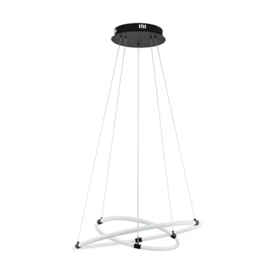 The decorative suspended ceiling light fixture with its two round LED profiles made from white plastic and a black metal ceiling mount blends seamlessly with minimalist and modern interiors Thanks to its special frameless LED tubes, the hanging lamp provides 360° illumination for the space; Suspended on adjustable lines, the profiles can be rearranged to customise the look of the light Dimensions: height: 120 cm/ 47.2 in, diameter: 60 cm/ 23.6 in