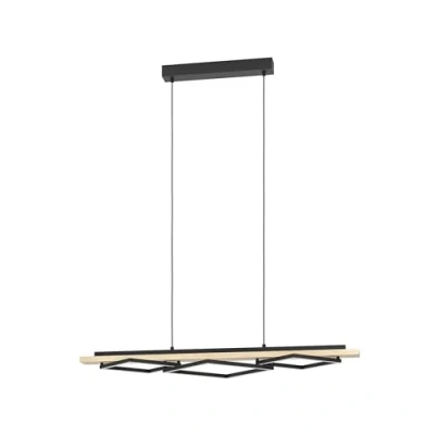 The LED hanging lamp combines natural charm with modern design; a beam made of FSC MDF with light, FSC-certified wood veneer meets three square, black metal light elements with white plastic covers and black textile cables The dining room light fixture is dimmable with a matching rotary dimmer on the wall; the LEDs provide pleasant warm white light and create a cosy atmosphere in your living spaces (3000 Kelvin, 2x 13 Watt, 2x 1750 Lumen/ 1x 16 Watt, 2200 Lumen) This product is a containing product with a light source of energy efficiency class E; containing products are lighting fixtures that can be disassembled for separate inspection of the containing light source(s)