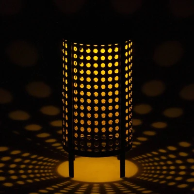 The solar lantern features a cylindrical lampshade made of beige and black steel and plastic with a woven look and four feet and creates atmospheric lighting effects with its round cut-outs The solar panel on the head of the lamp makes the solar light flexible to use as a solar table lamp, outdoor light on balcony and terrace, or garden lamp The LED outdoor lighting is ideal as illuminated garden decoration, balcony decoration or terrace lighting; the solar table lamp provides atmospheric lighting on the balcony, terrace or in the garden with its warm white light (3000 Kelvin, 0.06 watt) Dimensions: height 26 cm, diameter 12.3 cm This product is solar-powered; according to the EU directive on energy consumption labelling, this light does not require an energy label