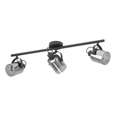 The frame made of black textured steel with three swivel lampshades made of black smoked glass combines modern design with functionality; The swivel spotlights provide targeted and individual lighting No light bulb included in the delivery Dimensions: length 77.5 cm, width 11 cm, height 24 cm