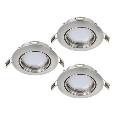 The round recessed spotlights in a set of three made of steel in matte nickel are adjustable and blend seamlessly into the modern trend The energy-saving LED bulbs are included in the delivery and provide pleasantly warm white light (each 5 watts) This product is a surrounding product with a light source of energy efficiency class F; surrounding products are luminaires that can be disassembled for separate inspection of the contained light source(s)