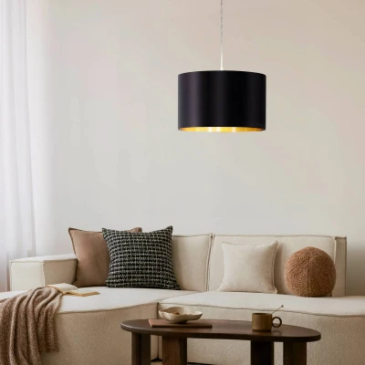 The Lecio hanging light features a round shape with a sleek black satin exterior that is beautifully complemented by its gold-coloured inner surface. This innovative design not only enhances the light's visual appeal but also creates a striking contrast, adding a touch of sophistication to any room. Similarly, the Maserlo pendant lamp showcases a modern material mix, featuring a matte nickel steel finish along with a luxurious black shade, embodying both homeliness and contemporary style.