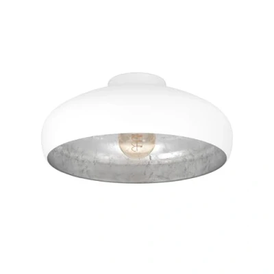 Timelessly beautiful ceiling lamp Mogano with silver interiorWith its diameter 40 cm large, half-shell-shaped metal lampshade, the ceiling lamp Mogano is ideal as basic lighting of many premises. Due to the silver-colored interior of the otherwise white shade, the light is wonderfully amplified scattered into the environment. Due to the simple and timeless design, the lamp harmonizes with many interior styles and also color concepts. In the existing E27 socket can be screwed all kinds of bulbs up to max. 60 W, so that it can be operated, among other things, with energy-efficient LED bulbs.